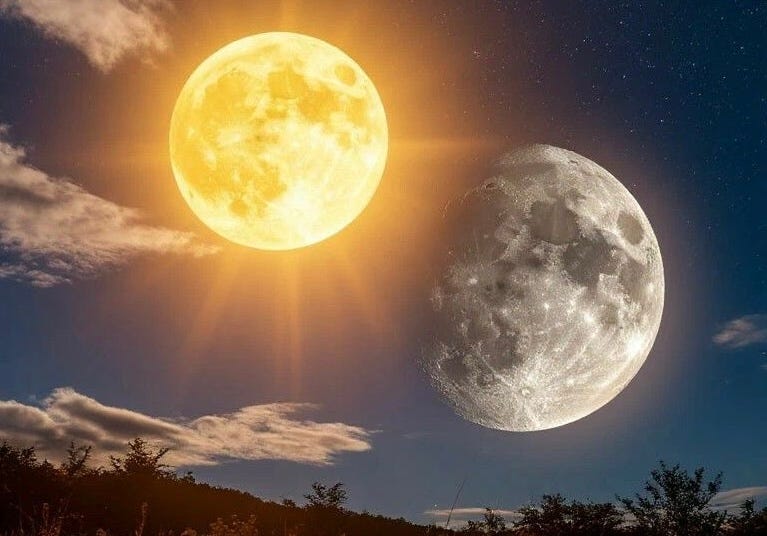 C’est ensemble, par l’union de ces deux principes, que la vie peut s’exprimer pleinement : le Soleil apporte la direction, l’impulsion et la lumière, tandis que la Lune apporte la fluidité, l’accueil et la maturation. Sans le Soleil, rien ne peut s’activer ni se diriger ; sans la Lune, rien ne peut croître ni s’incarner. Dans ce sens, ils représentent non seulement le masculin et le féminin, mais aussi l’énergie créatrice fondamentale qui anime tout ce qui vit.